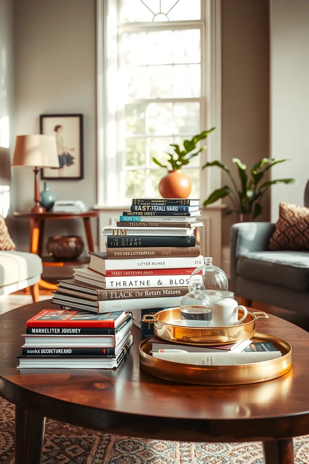 On the coffee table, a layered arrangement of treasures unfolds—an antique brass tray holds a steaming cup of coffee and a delicate porcelain teacup, while a small potted succulent adds a pop of vibrant green. Stacks of books are artfully piled beside a vintage magnifying glass and a charming, weathered globe, encouraging exploration and imagination. The scene is finished with a few carefully chosen decorative objects, such as a framed black-and-white photograph and a whimsical ceramic owl, enriching the narrative that each item tells. This inviting tableau not only celebrates the joy of reading but also inspires a sense of adventure and discovery in every corner.