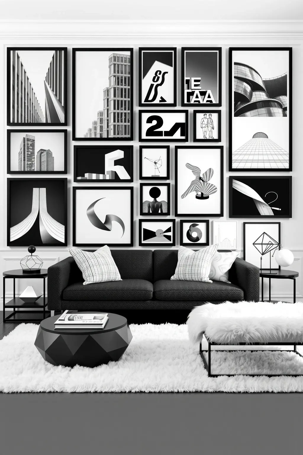 Step into a realm of elegance with the captivating ‘Monochrome Dreams’ living room, where a striking black frame gallery wall serves as the focal point. The gallery wall is a stunning array of framed black-and-white photographs, each piece meticulously arranged to create a sense of harmony and sophistication. Bold geometric patterns dance across the walls, while soft, muted textures provide a gentle balance, inviting the eye to explore each unique frame. Rich charcoal gray walls enhance the dramatic effect, enveloping the space in a cozy yet contemporary embrace.