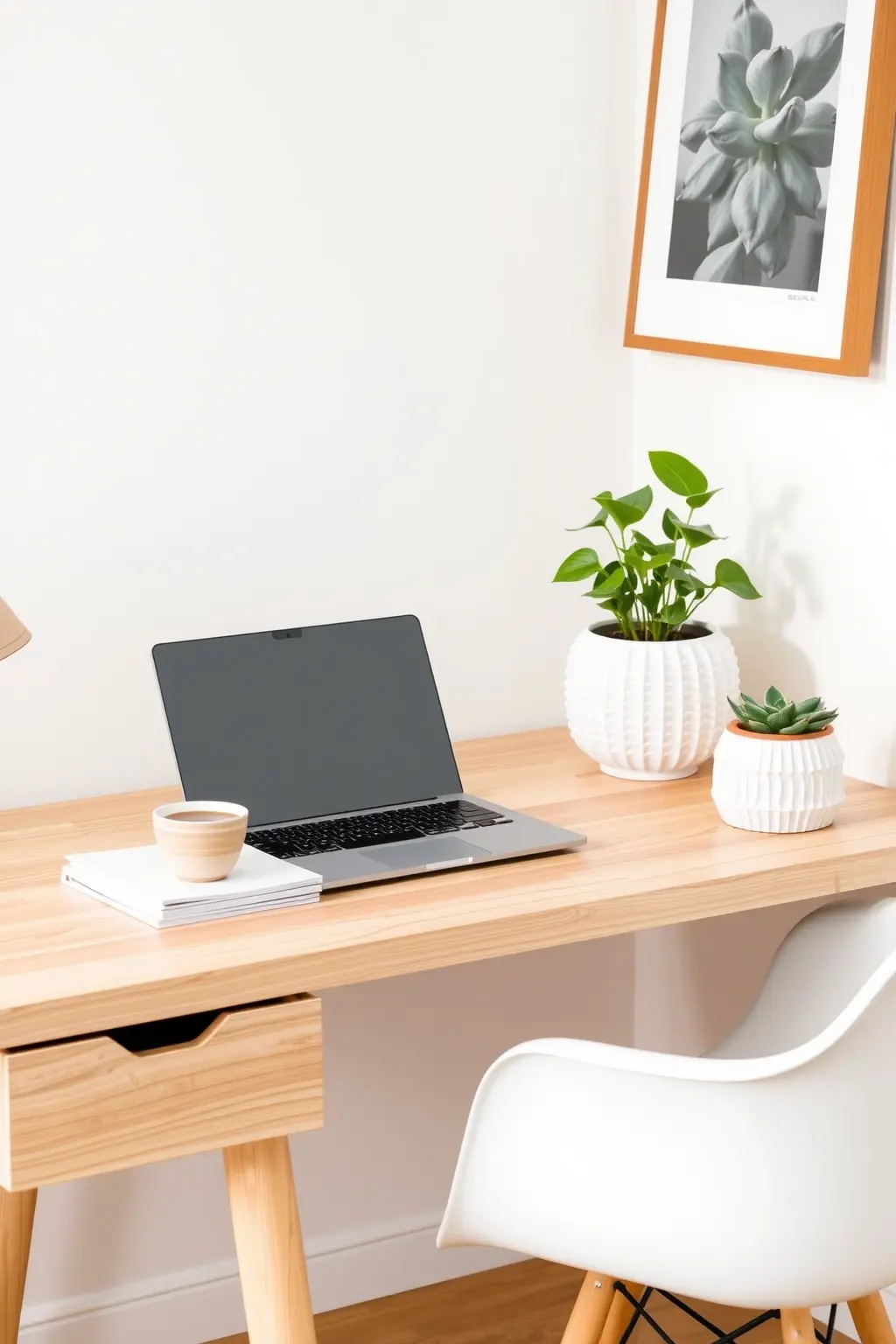 Imagine a workspace that calms your mind and sparks your creativity. With a sleek, pale wood desk paired with soft beige accents, this setup invites tranquility. Toss in a few delicate green plants, like a snake plant or peace lily, and youâll feel your stress melt away as you work. The subtle pops of greenery not only breathe life into the space but also promote a sense of well-being.